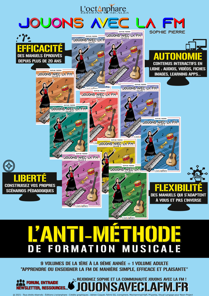 Découvrez Jouons avec la FM, l’anti-méthode de formation musicale ! Une collection de 10 manuels par Sophie Pierre et illustrée par David Camescasse, de la première année de FM au certificat d’études musicales pour enseigner ou apprendre de manière simple, efficace et plaisante !