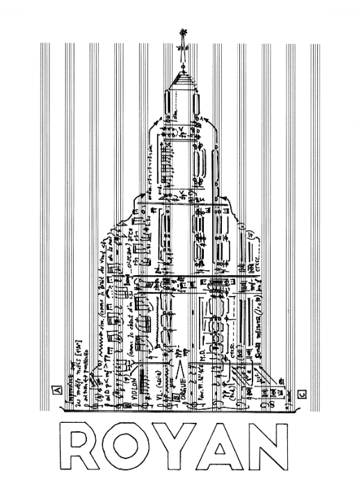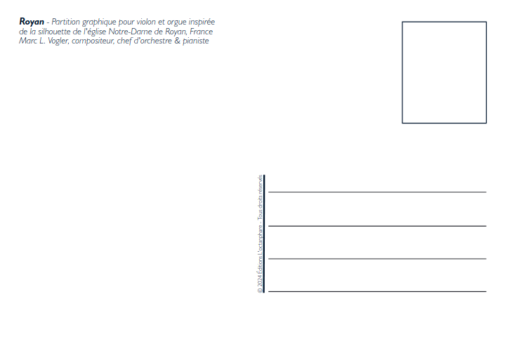 Carte postale représentant l’œuvre musicale conceptuelle « ROYAN » de Marc Vogler, en forme de l’église Notre-Dame de Royan, France.