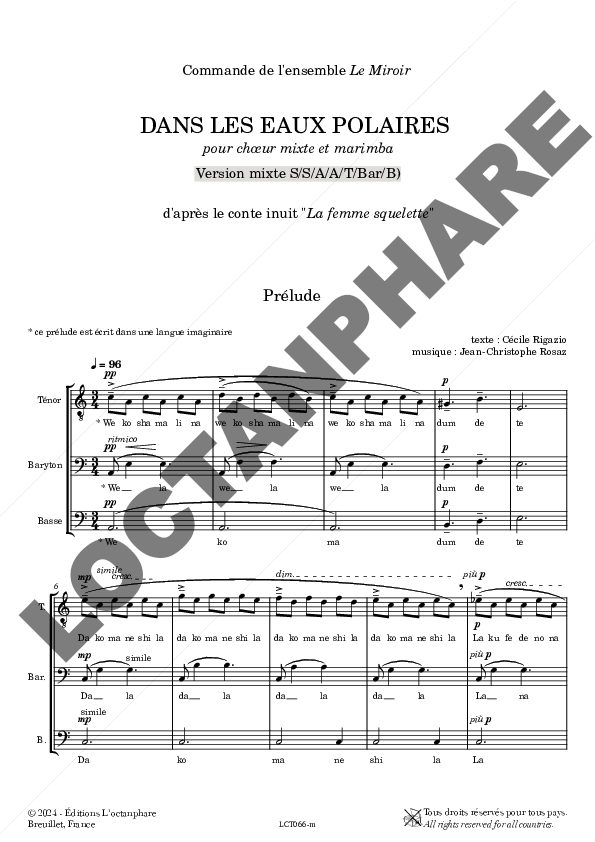 Le chœur de femmes peut inviter le chœur d’hommes ou s’en passer ! Enfin le joueur de marimba peut s’il le désire improviser un solo entre deux tableaux inspiré de l’univers musical de l’œuvre. »
