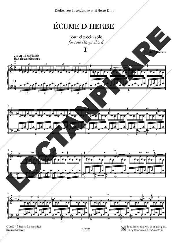 Écume d’herbe est une pièce pour clavecin solo dédicacée à et créée par Hélène Diot le 22/11/2022 à Amiens dans le cadre de la Semaine Internationale de la Musique Électroacoustique et de la Créativité.